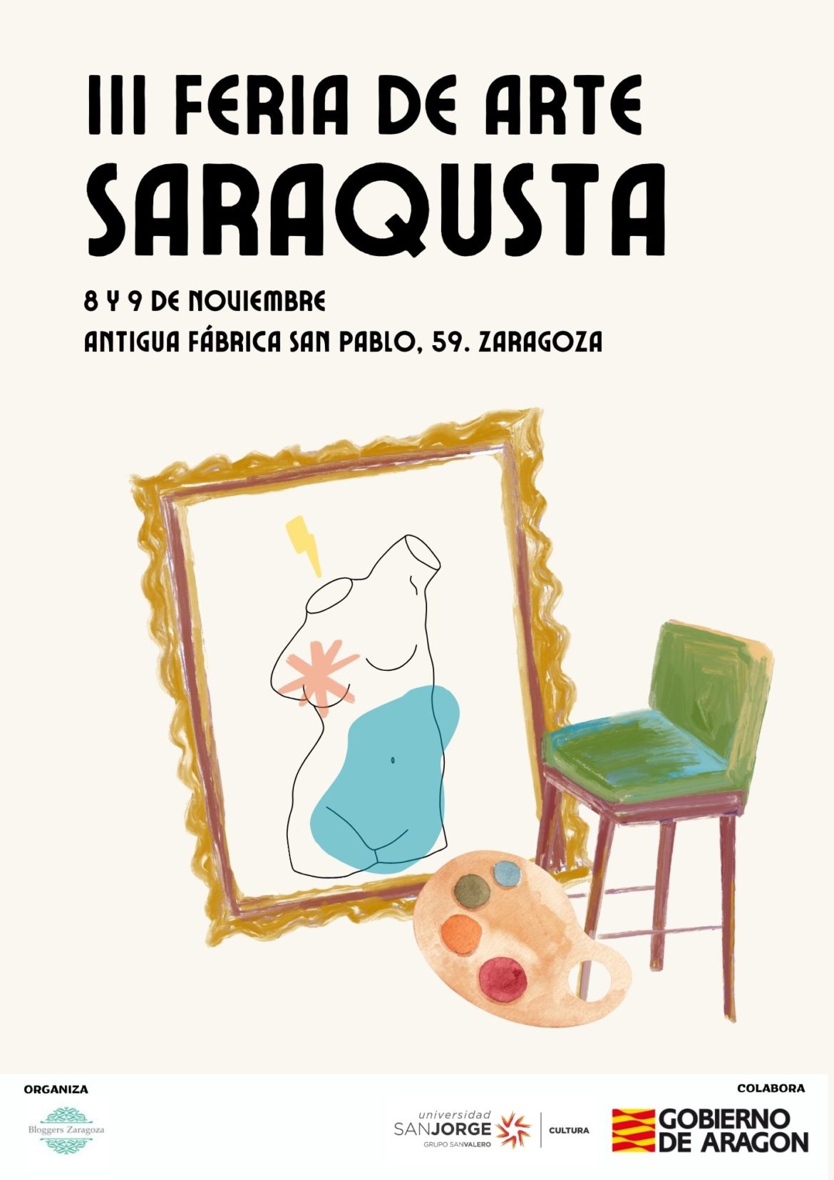 El fin de semana del 8 y 9 de noviembre se celebra la III edición de la Feria de Arte Saraqusta en la antigua fábrica de San Pablo, 59. Organizada por Bloggers Zaragoza, y con la colaboración del Gobierno de Aragón (a través del IAACC Pablo Serrano) y la Universidad San Jorge, la Feria de Arte “Saraqusta” ofrece un espacio en el que artistas emergentes tienen la oportunidad de exponer su trabajo y darlo a conocer al público que podrá acceder al evento con entrada libre.