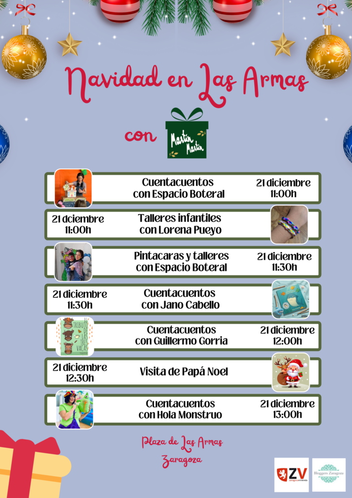 Este domingo 21 de diciembre, Papá Noel visitará la Plaza de Las Armas desde las 12:30 horas. Los más pequeños podrán dejar su carta a Papa Noel o los Reyes Magos en nuestro buzón navideño y recibirán un dulce detalle gracias a Martín Martín. También nos acomparán Espacio Boteral desde las 11 de la mañana con sus manualidades, cuentos y pintacaras. Habrá talleres familiares con Lorena Pueyo desde las 11 horas y más cuentacuentos con Jano Cabello y ‘El Tiburón que no tenía dientes’ a las 11:30h, Guillermo Gorria y ‘El Tributo de las Tres Vacas’ a las 12 y mucha diversión con las historias de Hola Monstruo a las 13 horas.