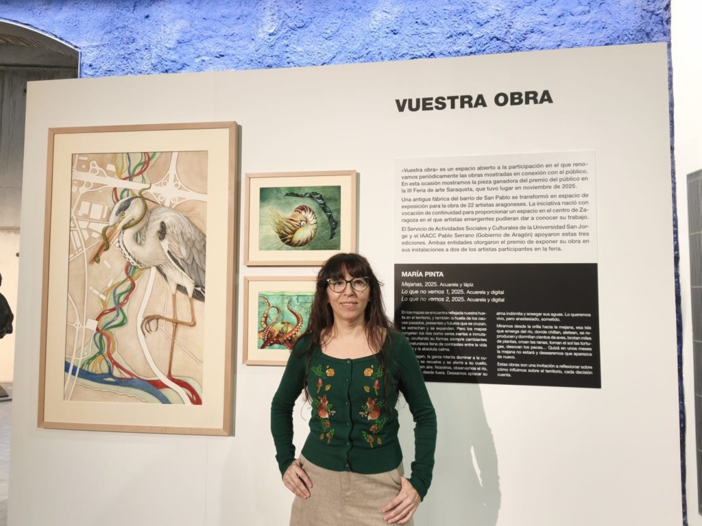 Por su parte, la ganadora del público, la ilustradora botánica María Pinta, expone en el espacio Vuestra Obra del IAACC Pablo Serrano, en el Paseo María Agustín nº 20 de Zaragoza. María Pinta ha seleccionado las acuarelas ‘Mejanas’, ‘Lo que no vemos 1’ y ‘Lo que no vemos 2’ para exponer en este espacio.